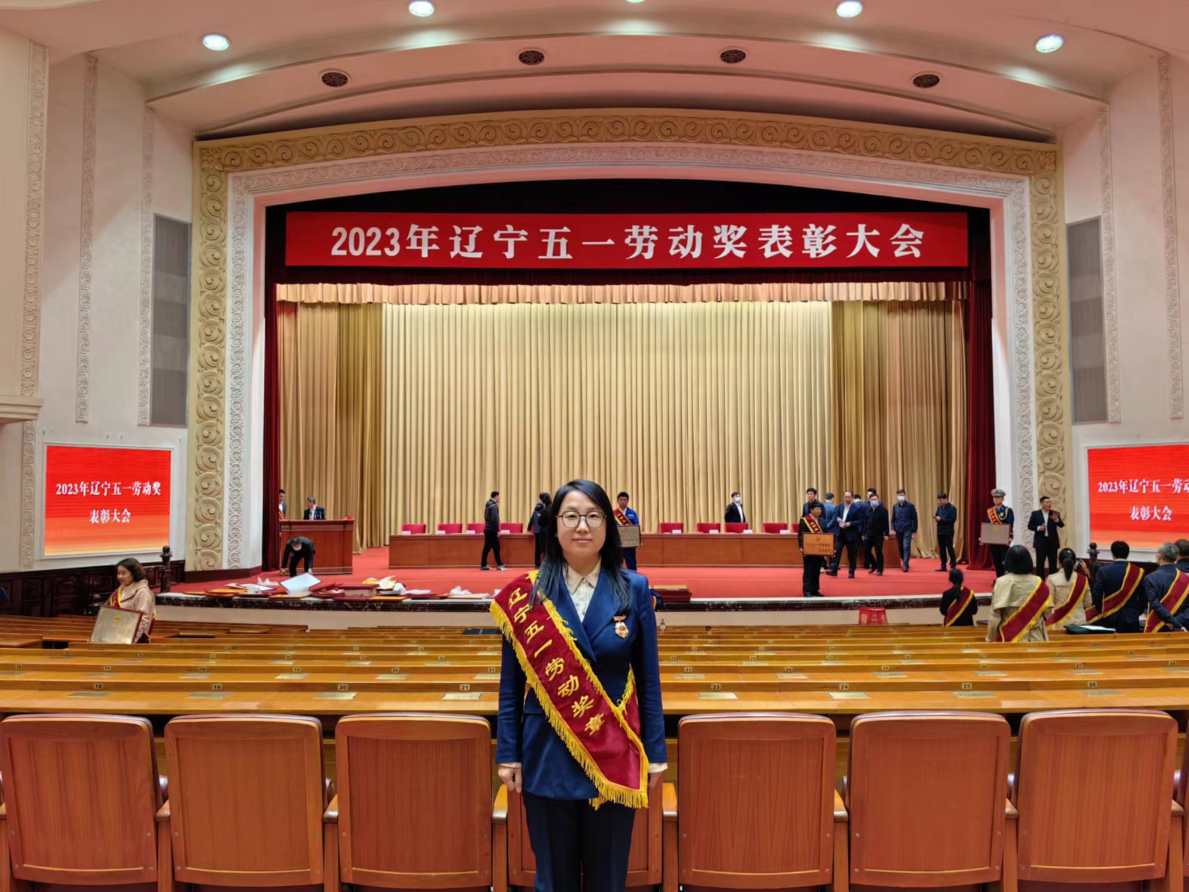 2023年4月27日,在省總工會舉辦的“2023年遼寧五一勞動獎表彰大會”上,益盛達公司又獲得了一項難得的榮譽,受邀參加的公司總經理鄒艷秋女士獲頒“2023年遼寧省五一勞動獎章”,并作為特邀代表上臺領獎。遼寧電視臺在當日的新聞聯播中對頒獎情況進行了報道,“金普發布”“朝陽商會”等公眾號也進行了專題報道。